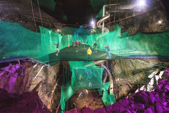 Set in a historic slate mine, Caverns is an underground course designed to challenge and thrill as you crawl through tunnels and chasms, climb across rope bridges and experience the thrill of 13 zip lines.